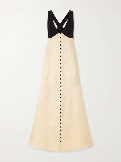 Rosie Assoulin's 'Row, Row, Row Your Buttons' dress highlights the power of contrast, both in texture and palette. Made from linen-blend, it has a V-neckline that's centered with matching covered fastenings. It's also subtly paneled for a hint of definition.