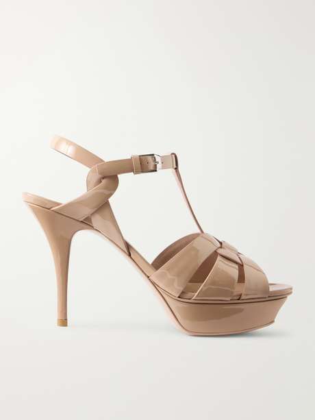 SAINT LAURENT's 'Tribute' sandals quickly gained cult status after they debuted in 2004 and remain one of the label's most iconic and best-selling styles to this day. Set on a leg-lengthening stiletto heel, this nude version has been crafted in Italy from patent-leather and is balanced by a platform front. Wear yours with everything from jeans to dresses.