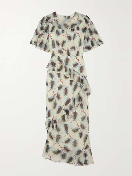 Saloni's 'Vida' midi dress is printed with quill feathers cascading down its length - a visual representation of how light and floaty it feels. It's made from silk-chiffon and trimmed with ruffles down to the asymmetric hem for a fluttery effect.