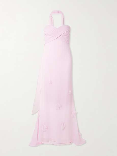 You'll be a vision in Self-Portrait's gown, which draws on the codes of Old Hollywood. It's made from floaty pink georgette with appliquéd flowers along the hem, and a coordinating scarf.