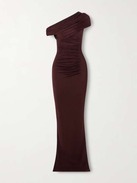 Self-Portrait’s dress is draped to sit elegantly off one shoulder. It's ruched along the side for pretty texture through the close fit. Wear yours with metallic accessories.