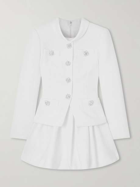 Designed with a voluminous bubble skirt, Self-Portrait's dress feels both sophisticated and playful. Made from bouclé-tweed, it has a chic jacket-inspired bodice and high satin-twill neckline. Let the statement crystal-embellished buttons shine with minimal accessories.