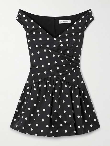 Self-Portrait's mini dress is reminiscent of pinup styles with its retro polka-dot pattern and shoulder-baring neckline. It's made from breathable cotton that's gathered at the fitted bodice and gathered at the dropped waist before flaring out to a floaty hem.