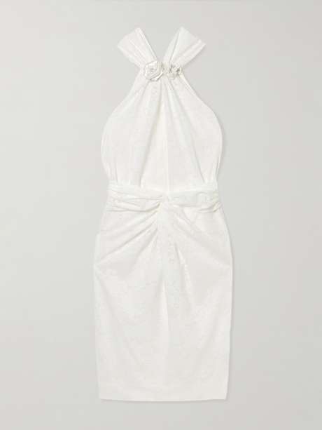 SHUSHU/TONG's mini dress is made from delicate white lace that's artfully ruched and gathered to draw the eye to the fitted waist. The halter neckline is embellished with florals, sequins and crystals, so you can forgo a necklace.