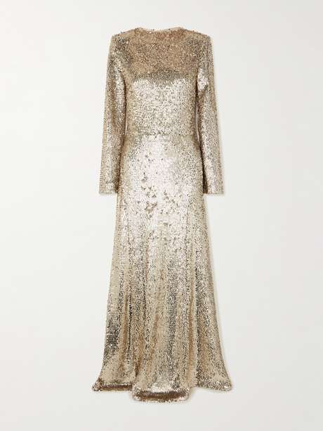 SIMKHAI's 'Beatrice' gown is covered with light-catching sequins that evoke the look of molten metal. It's made from satin-lined tulle with an elegant high neckline and dramatic floor-pooling hem.