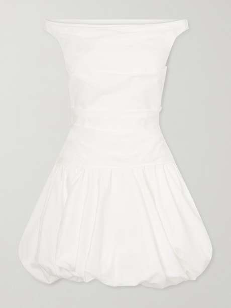 SIMKHAI brings back the '80s bubble hem with this 'Salina' mini dress. It's made from cotton-blend poplin, detailed with an elegant boat neckline and ruched bodice. Wear yours with pearl jewelry.