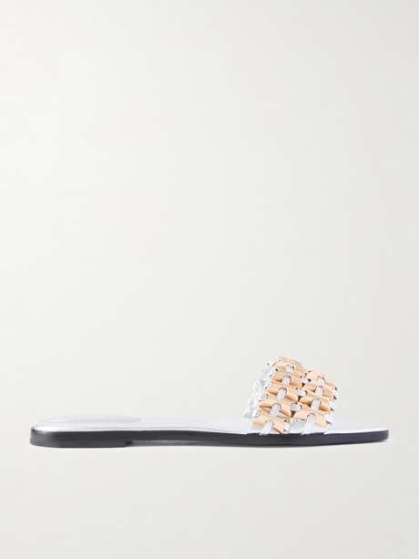 Simkhai's 'Faye' slides are defined by the gold-tone bead hardware tracing the wide straps. They're made from silver leather and have squared-off toes. Wear yours with jeans or floaty dresses.