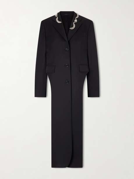 Simone Rocha's coat brings a sculptural twist to classic tailoring with its extended hip cutaways. Woven with a generous amount of wool and finished with sparkling embellishments around the notched lapels, it balances drama with refinement.