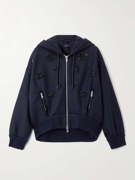 In signature Simone Rocha style, this jacket is adorned with sparkling crystals, beads and sequins. Debuted on the Fall '25 runway, it's made from insulating wool-blend in a hooded bomber profile.