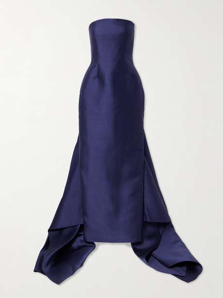 Solace London's sculptural dresses blend the timeless with the contemporary, so styles like this 'Imani' gown are perfect for modern enthusiasts. It's made from navy twill in an elegant column silhouette and has a beautiful pleated train. Complement the strapless neckline with a sparkling necklace.