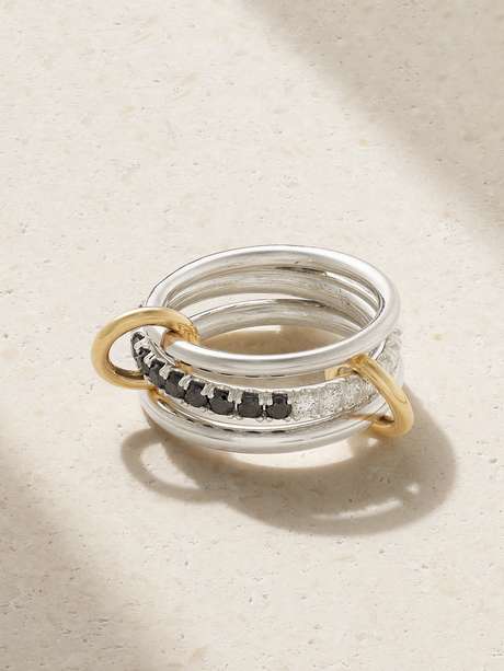 Spinelli Kilcollin's interlocking 'Petunia' ring is handcrafted from sterling silver and has 18-karat gold connectors, so you can style them stacked or spanned out across your fingers. The central band is set with 1.20-carats of contrasting blackened and white diamonds.