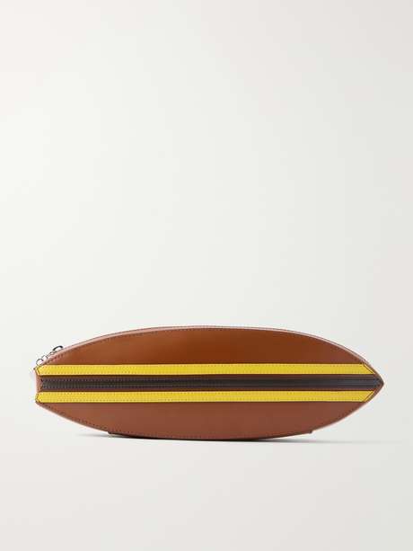 STAUD’s ‘Surfboard’ clutch echoes the clean lines of its namesake. Crafted from smooth leather in a warm brown hue, it’s detailed with contrasting stripes and a shark tooth-inspired zip that lends a playful edge.