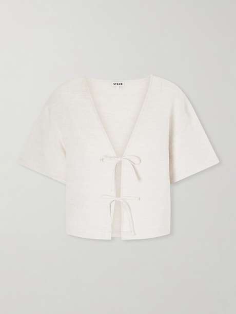 STAUD’s ‘Ava’ blouse captures an effortless, pared-back mood. Made from linen, it’s shaped with a relaxed, boxy silhouette and adjustable ties at the front.