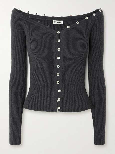 STAUD Keaton off-the-shoulder ribbed cotton and wool-blend cardigan