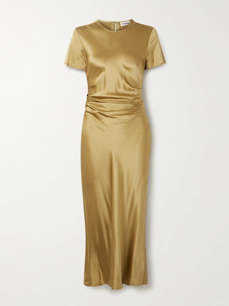 STAUD's 'Marcel' dress is made from stretch-silk charmeuse in a pretty 'Antique' shade that really enhances the fabrics natural sheen. It's gently ruched at the waist and falls to a fluid midi hem.