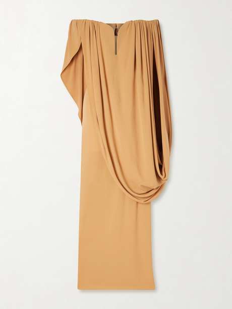 There's a dramatic elegance to Stella McCartney's gown. Made from certified crepe-jersey, it has an off-the-shoulder neckline that drapes into a cape-effect panel and falls to a floor-sweeping split hem. Complement the warm shade with gold jewelry.
