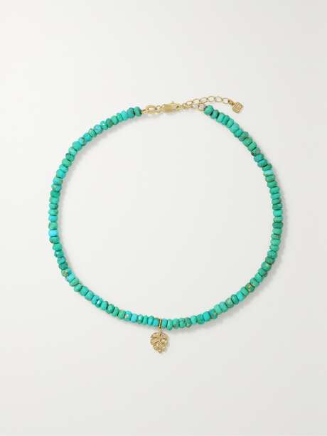 SYDNEY EVAN Tiny Monstera Leaf 14-karat gold, turquoise and diamond bracelet