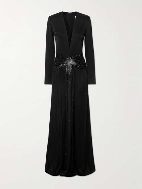 The New Arrivals Ilkyaz Ozel's 'Azure' gown is encrusted with crystals at the knotted waist, appearing like a starry constellation. Made from figure-skimming stretch-jersey, it has a plunging neckline and is fitted with shoulder pads. Style yours with metallic accessories.