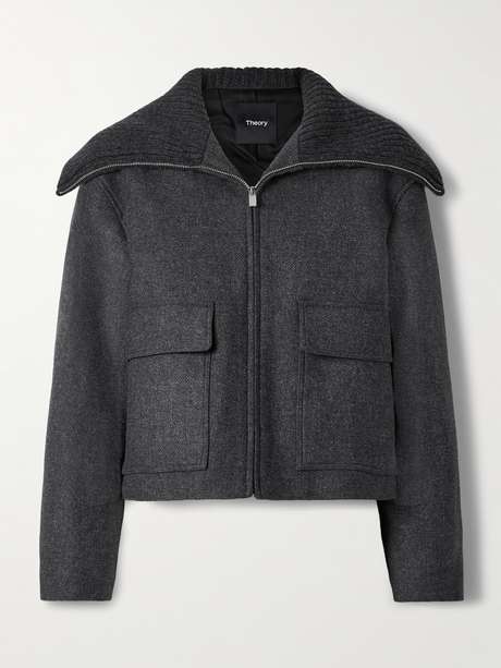 Theory's jacket has a generous ribbed collar that lays flat on the shoulders when unzipped. It's made from wool-blend twill and features utilitarian pockets.