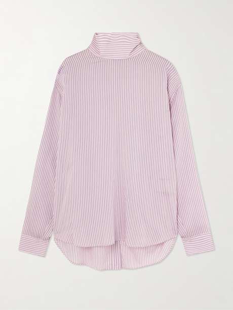 Tibi's blouse feels so elegant with its fluid drape and feminine palette. Made from a blend of fluid Lyocell and silk, it has dropped shoulders, a slim fit and a statement turtleneck. The stripes add a touch of definition.