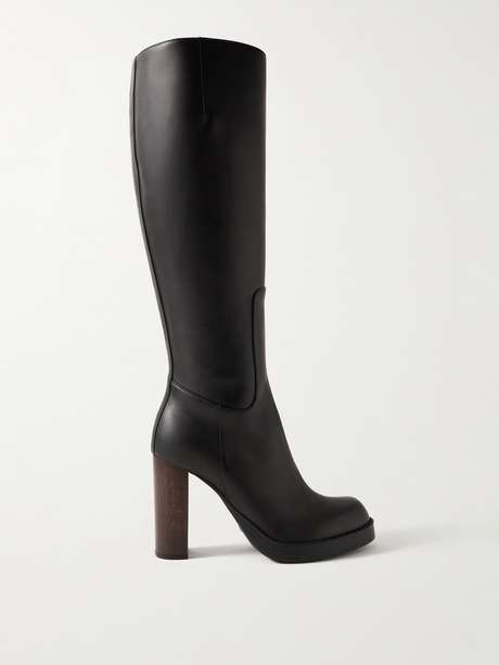 Tod's sleek knee boots were styled with multiple looks on the label's Fall '25 runway. Made from smooth leather, they have rounded toes and 100mm block heels that are balanced with minimal platforms.