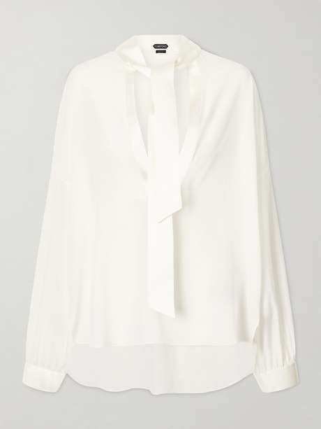 TOM FORD's shirting is as classic as the house's power tailoring. This blouse has been made in Italy from lightweight silk crepe de chine, chosen for its natural drape. The neckline is adorned with pussy-bow ties, made from satin for subtle contrast.