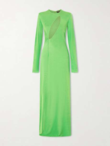 Few designers command drama with such confidence as TOM FORD, whose eveningwear is defined by precision and sensuality. This gown features a bold cutout that sculpts the silhouette while revealing a flash of skin. Wear yours with sleek heels – black or silver would look striking against the green crepe-jersey.