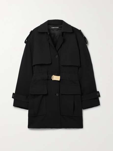 TOM FORD's designs are both timeless and powerful. This short trench coat has been made in Italy from cotton-jersey in a versatile black hue. It's detailed with a logo-stamped belt buckle in gold-tone metal that's polished to a high gleam.