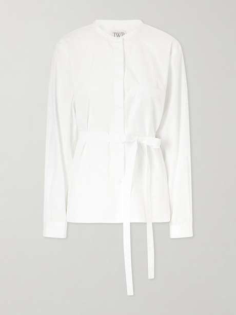 TWP's shirt reworks the classic white shirt with a tie detail. Crafted from cotton, it has a collarless neckline and a relaxed fit through the body. Style it loosely tucked into tailored pants for a clean, modern look.