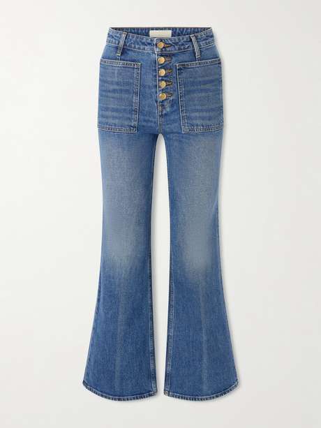 Ulla Johnson's 'The Lou' jeans have a '70s-inspired design with a high-rise waist and flared legs. Complete with sizable patch pockets, they're handmade from structured denim blended with 20% recycled cotton. The exposed gold-tone buttons are etched with the label's logo.