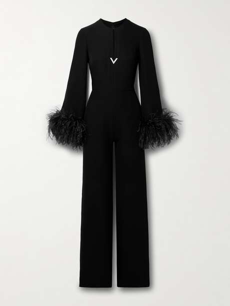 Valentino Garavani's jumpsuit is traced with wispy feathers along the cuffs - just imagine how pretty they'll look when reaching for a champagne flute or waving across the room. It's made from silk and has a skin-baring keyhole cutout at the front that's tempered by a crystal-encrusted silver-tone 'V' plaque.