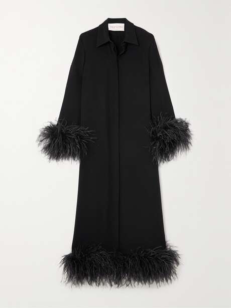 Valentino Garavani's Pierpaolo Piccioli often uses feathers in his collections, and we just love the results. This midi shirt dress is made from silk crepe de chine in a simple but chic silhouette elevated by the flouncy trims.