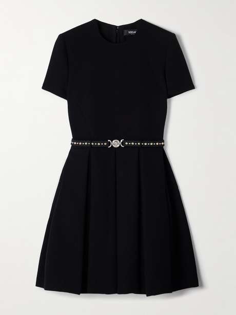 Versace's mini dress is made from wool-crepe that fits slim through the bodice before flaring out at the pleated skirt. The accompanying belt features silver-tone hardware, including studs and the signature 'Medusa' motif. Wear yours with a blazer and point-toe pumps.