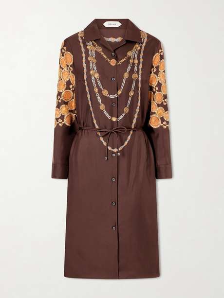 This Versace 'The Lover' mini dress is crafted from silk-twill and features an intricate, baroque-inspired print layered with chain motifs across the bodice. Designed with a sharp point collar and button-through front, it blends tailored structure with fluid drape.
