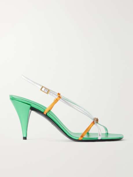 Versace's sandals are defined by their luminous finish. Crafted from leather, they have slender, intersecting straps in gold and silver centered with the house's 'Medusa' logo hardware and are set on metallic-green heels that complete the color-blocked effect.