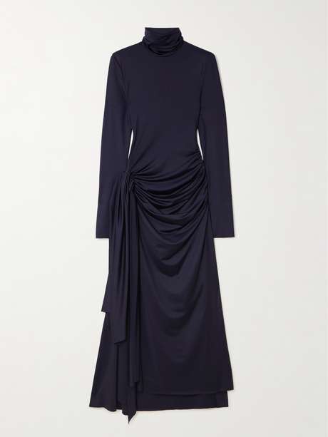 EXCLUSIVE AT NET-A-PORTER. Victoria Beckham's dress is so effortlessly glamorous. Cut from slinky jersey, it's draped and gathered at the hip and falls to a flowing asymmetric hem. Complement the turtleneck with statement earrings.