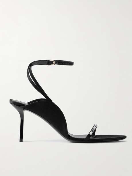 The baguette-cut crystals topping Victoria Beckham's 'Eliza' sandals glisten beautifully, so choose hemlines that keep them on full display. Made from leather-backed satin, they have padded insoles for comfort whether you're walking or dancing.