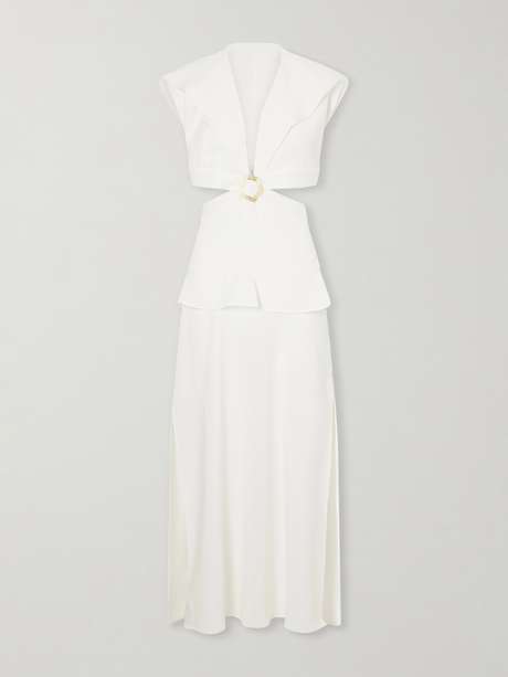 'Leone Butterfly' dress by Violante Nessi is designed with a deep V-neckline and sculptural cutouts, anchored by a central ring detail. The fitted bodice falls into a fluid, mid-length skirt. Style it with simple heels for a clean, evening look.