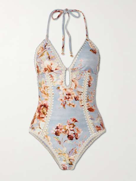 ZIMMERMANN Awaken crochet-trimmed floral-print halterneck swimsuit