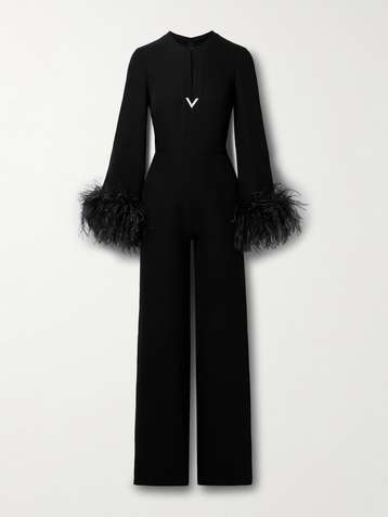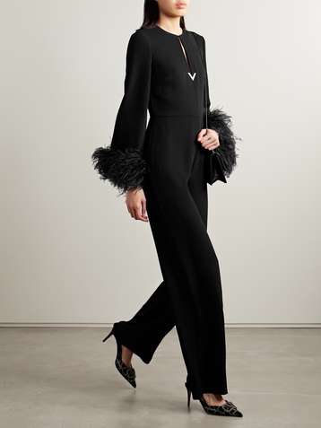Cutout embellished feather-trimmed silk jumpsuit