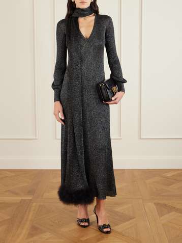 Robe midi en mailles côtelées métallisées à plumes et à écharpe