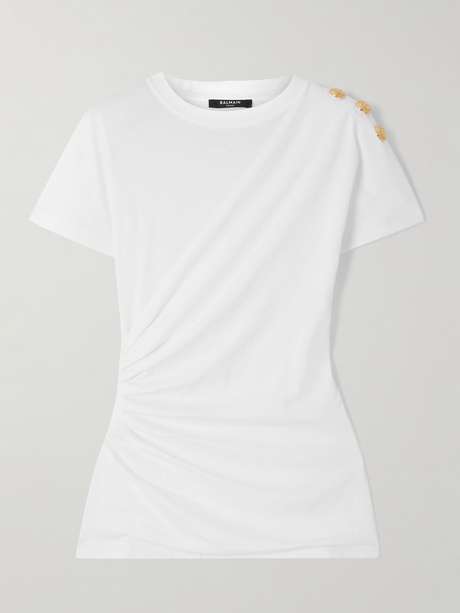 Ce T-shirt Balmain est immédiatement reconnaissable grâce à ses boutons dorés à tête de lion au niveau de l’épaule, l’une des signatures de la marque. Il est réalisé en jersey de coton et soigneusement drapé sur le devant. Au dos, vous verrez qu'il est imprimé d'une petite version du logo de la maison.