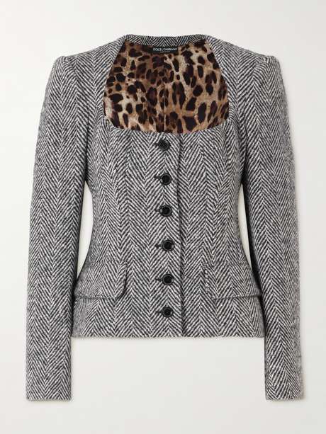 Cette veste Dolce&Gabbana présente une silhouette féminine inspirée des corsets traditionnels. Elle est confectionnée en laine à chevrons, possède un décolleté en forme de trapèze et s’achève sur un ourlet légèrement évasé.