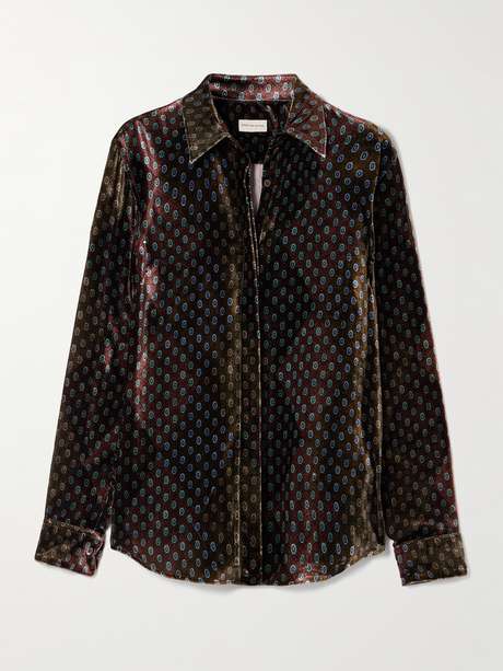 Cette chemise Dries Van Noten s’habille d’un motif à pois inspiré des cravates masculines traditionnelles. Elle est réalisée en velours duveteux, pourvue d’un col en pointe, et présente une patte de boutonnage dissimulée pour une allure épurée. Laissez-la ouverte au niveau du col pour un look plus décontracté.