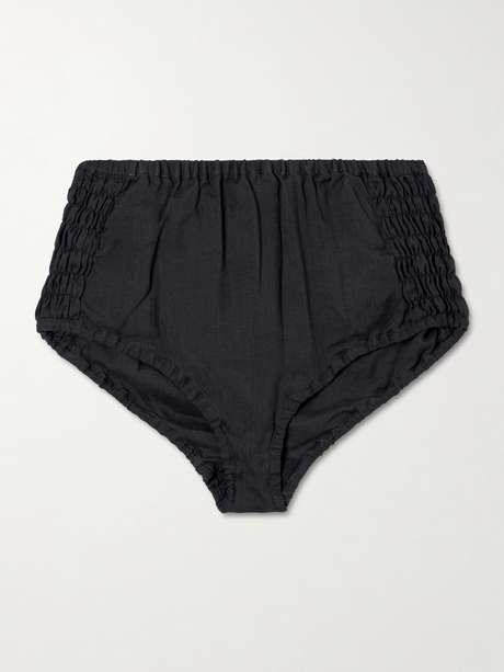 Ce mini-short fait partie de la collection printemps-été 2026 de Dries Van Noten. Il est réalisé en ramie, agrémenté de smocks sur les côtés, et adopte une coupe slim. Portez-le seul ou sous une jupe transparente.