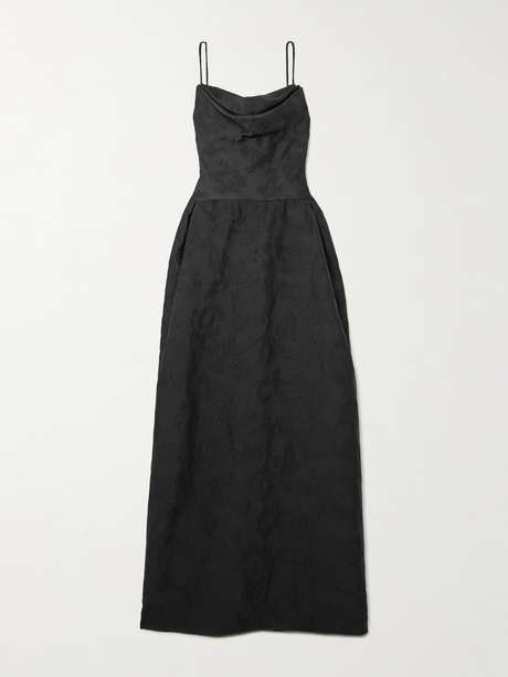 Inspirée du film Les Oiseaux d’Alfred Hitchcock, la collection automne-hiver 2025 d’Emilia Wickstead apporte une note sombre à l’esthétique romantique signature de la marque. La robe du soir Kiril est réalisée en jacquard, et présente un col bénitier ainsi qu’un corsage baleiné. Elle se voit rehaussée de plis creux au niveau des hanches, ce qui confère un joli volume à sa jupe.