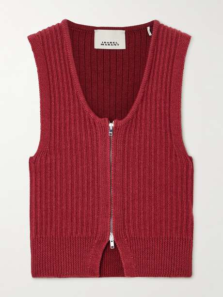 Le cardigan sans manches Devima était porté par-dessus une chemise aux manches bouffantes lors du défilé automne-hiver 2025 d’Isabel Marant, qui était rehaussé de touches de rouge à l’esprit rebelle. Il est confectionné en laine côtelée, doté d’un décolleté arrondi profond et s’ajuste grâce à une fermeture à glissière double curseur sur le devant.