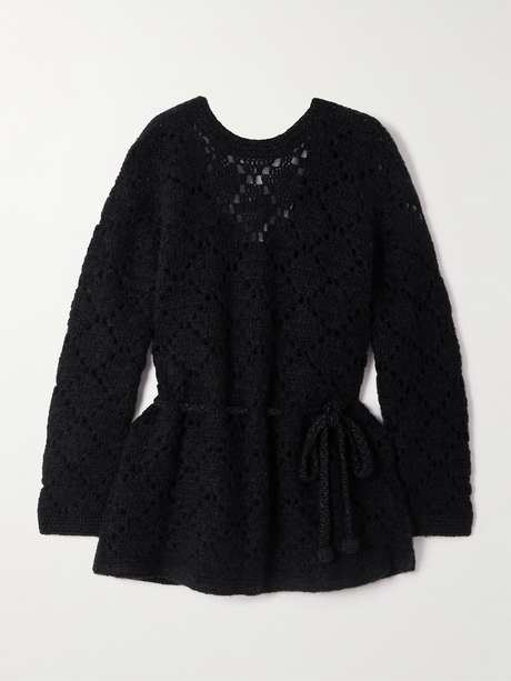Le pull Merida d'Isabel Marant fait partie de la collection automne-hiver 2025 de la griffe, qui rehausse les détails bohèmes emblématiques de la marque parisienne d’une touche New Wave. Il contient des portions de laine et de mohair, présente des mailles ajourées ainsi qu’un dos joliment échancré et s’accompagne d’une ceinture à nouer intégrée, pourvue de pompons à ses extrémités.
