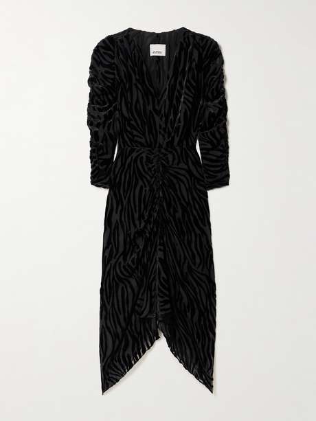 Isabel Marant excelle dans l’art de créer des robes bohèmes qui peuvent être portées en toute occasion. Le modèle Nemil, un parfait exemple, est confectionné à partir d’un velours dévoré zébré au fini semi-transparent. Elle est froncée au niveau des manches et également de la taille, ce qui rend son ourlet midi asymétrique.