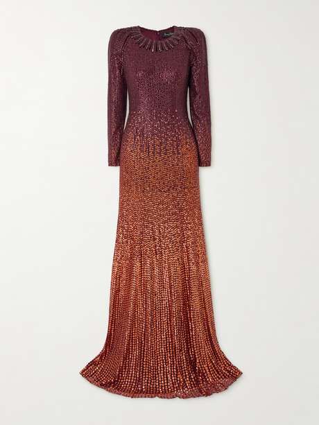 Cette robe signée Jenny Packham vous permettra de toujours faire sensation en franchissant les portes d’un lieu de réception. Elle est réalisée en tulle, dotée d'épaules structurées et ornée d'une myriade de sequins scintillants allant du bordeaux à l'orange. Sa doublure en satin lui garantira un tombé impeccable.